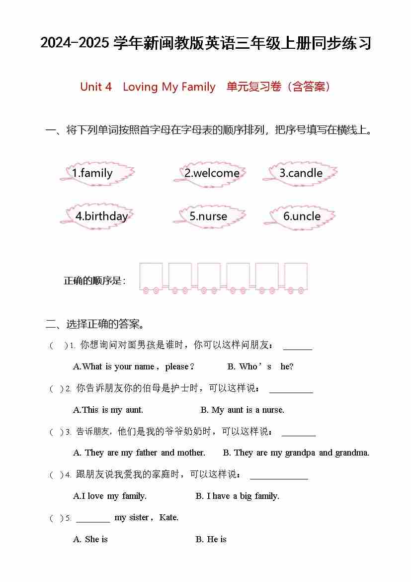 Unit 4 Loving My Family (单元测试)-2024-2025学年闽教版(2024)英语三年级上册