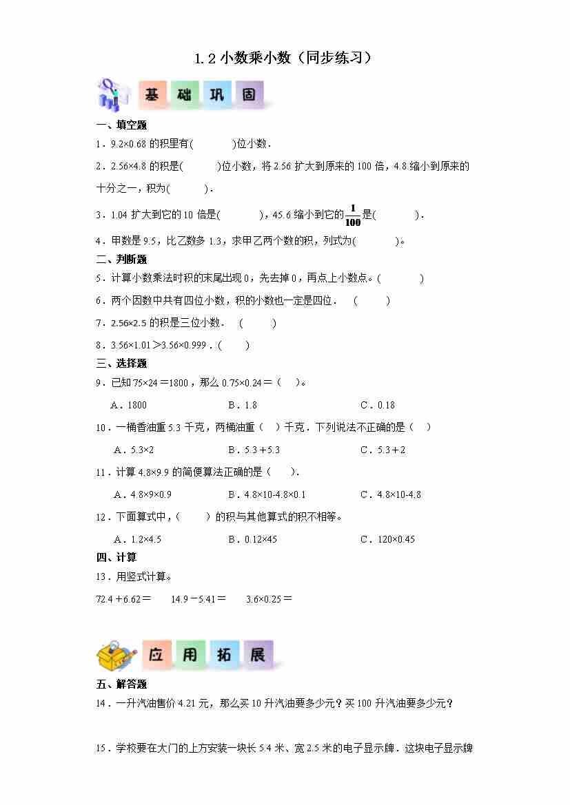 1.2小数乘小数(同步练习)五年级数学上册课后分层作业(西师大版)