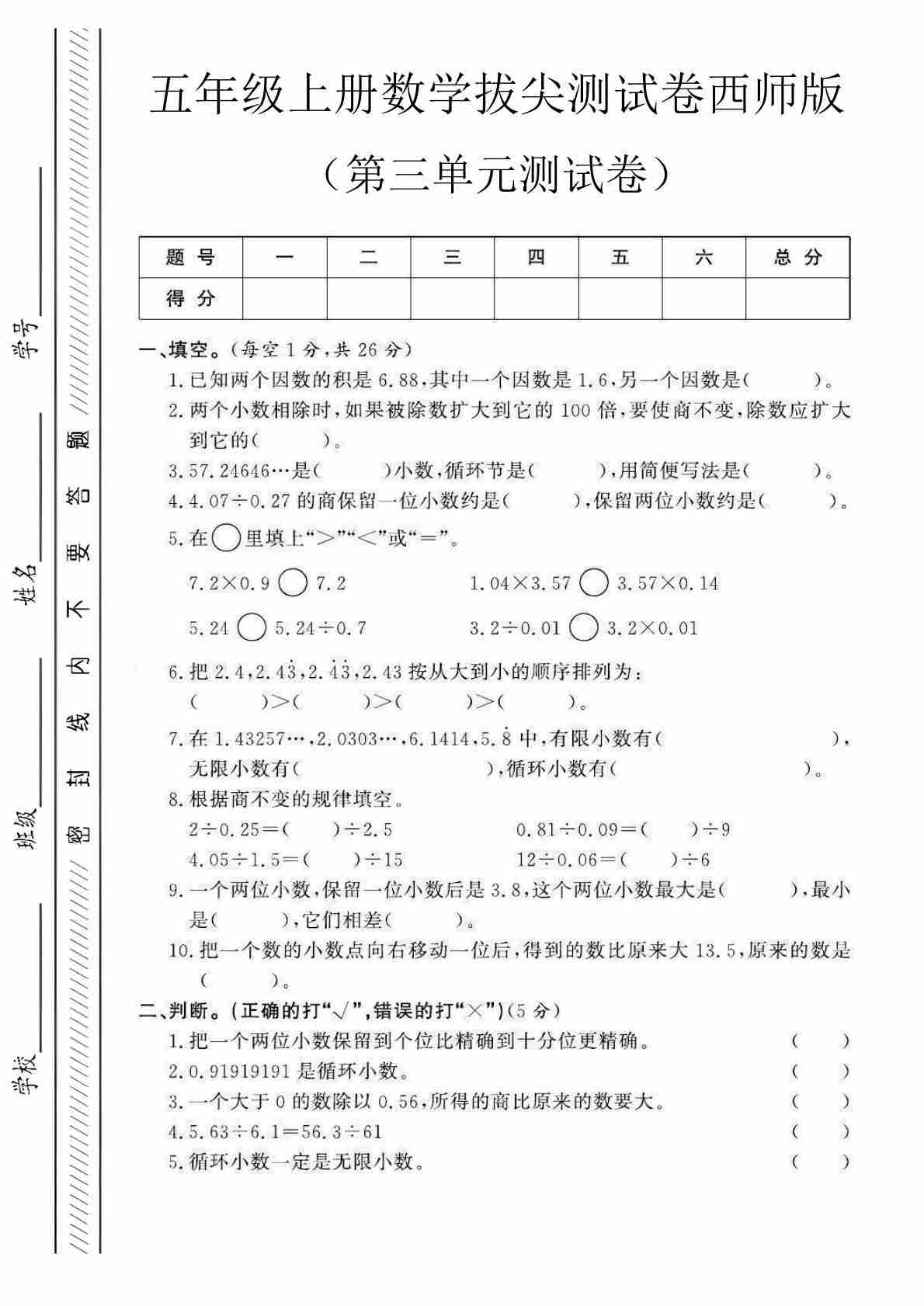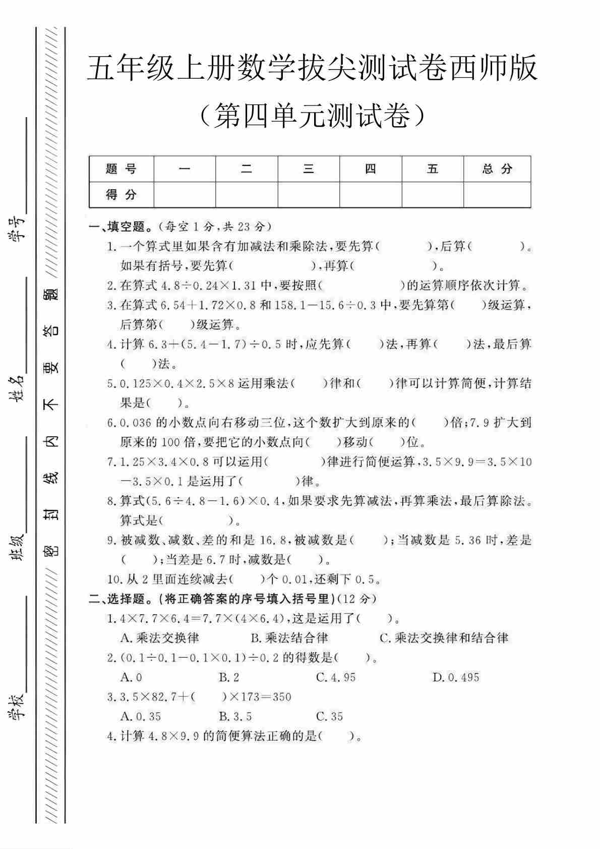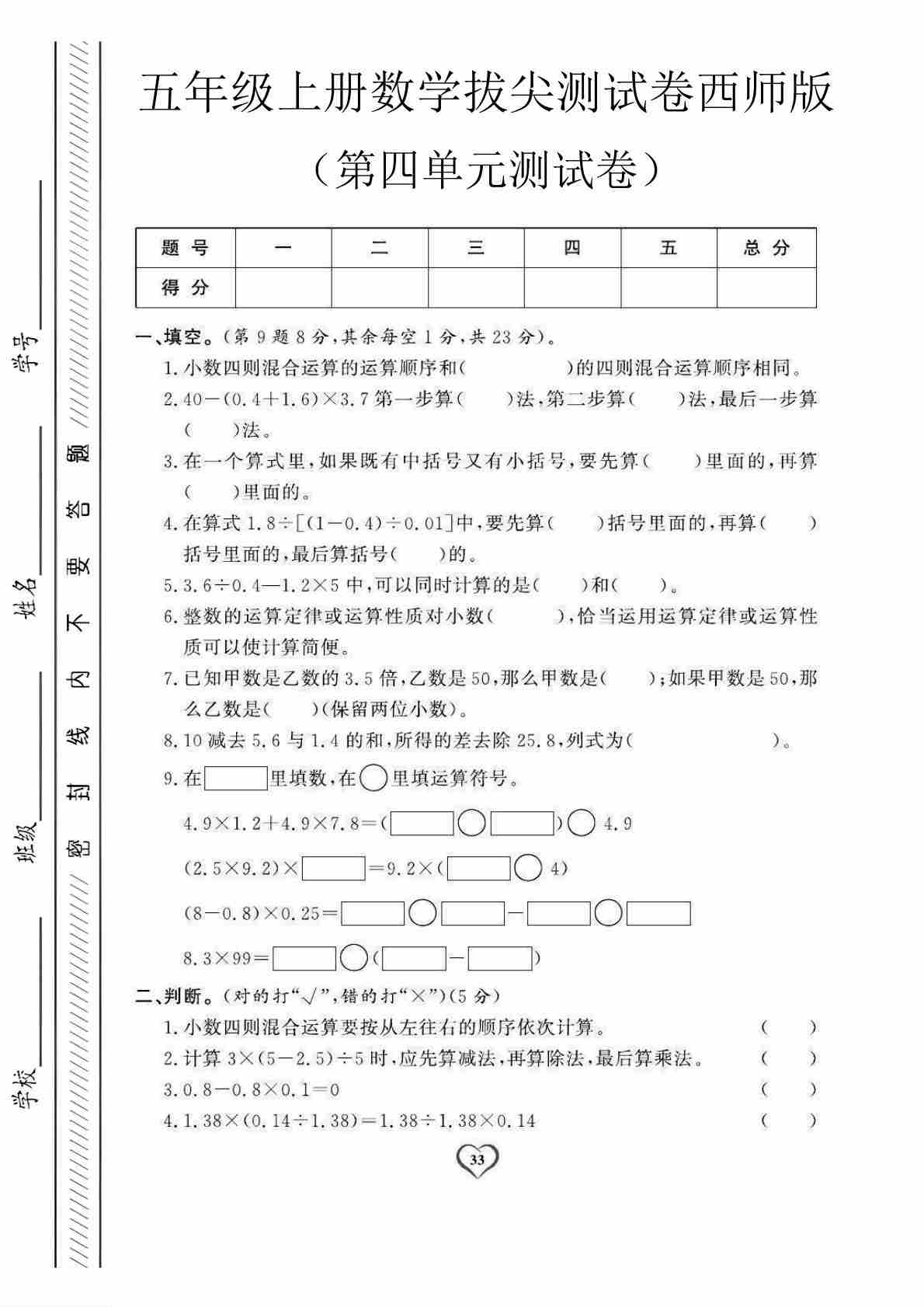 五年级(上)数学单元口算练习第一单元《青岛63版》