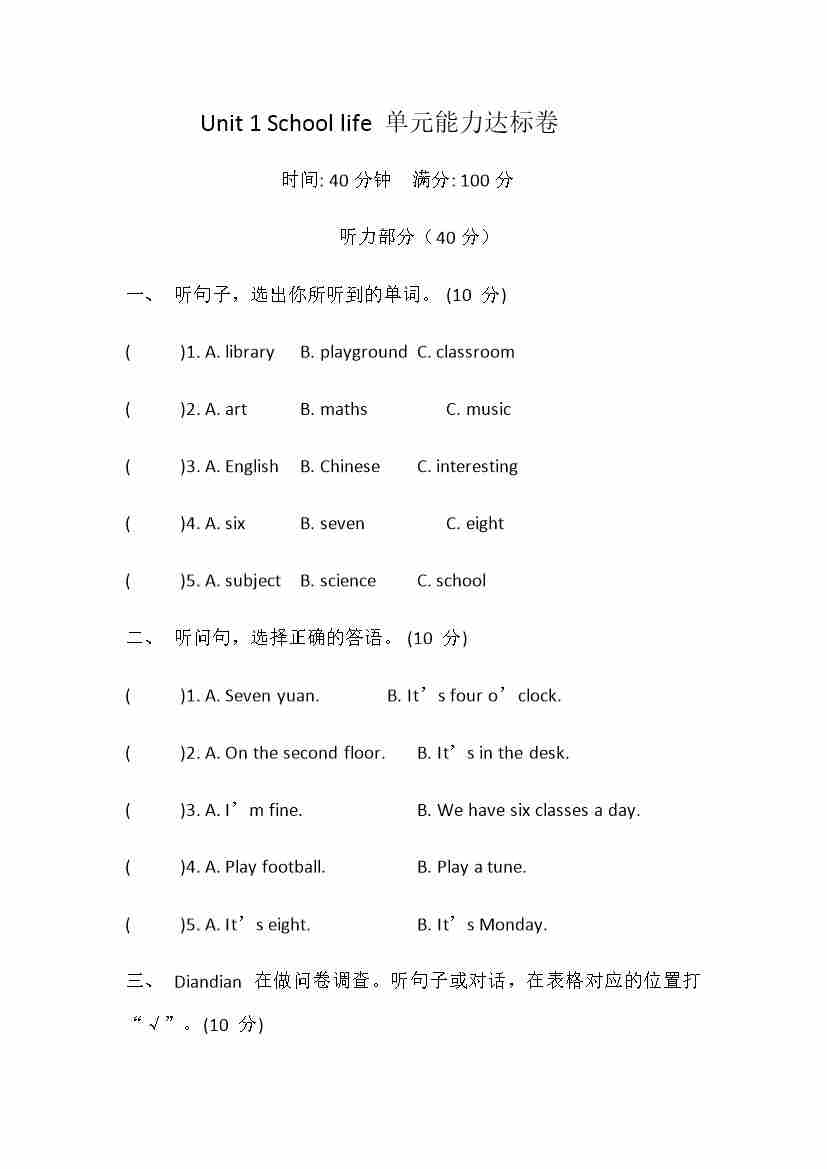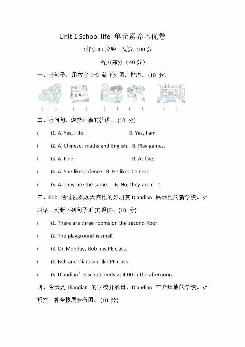 Unit 1 School life 单元能力达标卷(含答案,含听力原文,无听力音频)