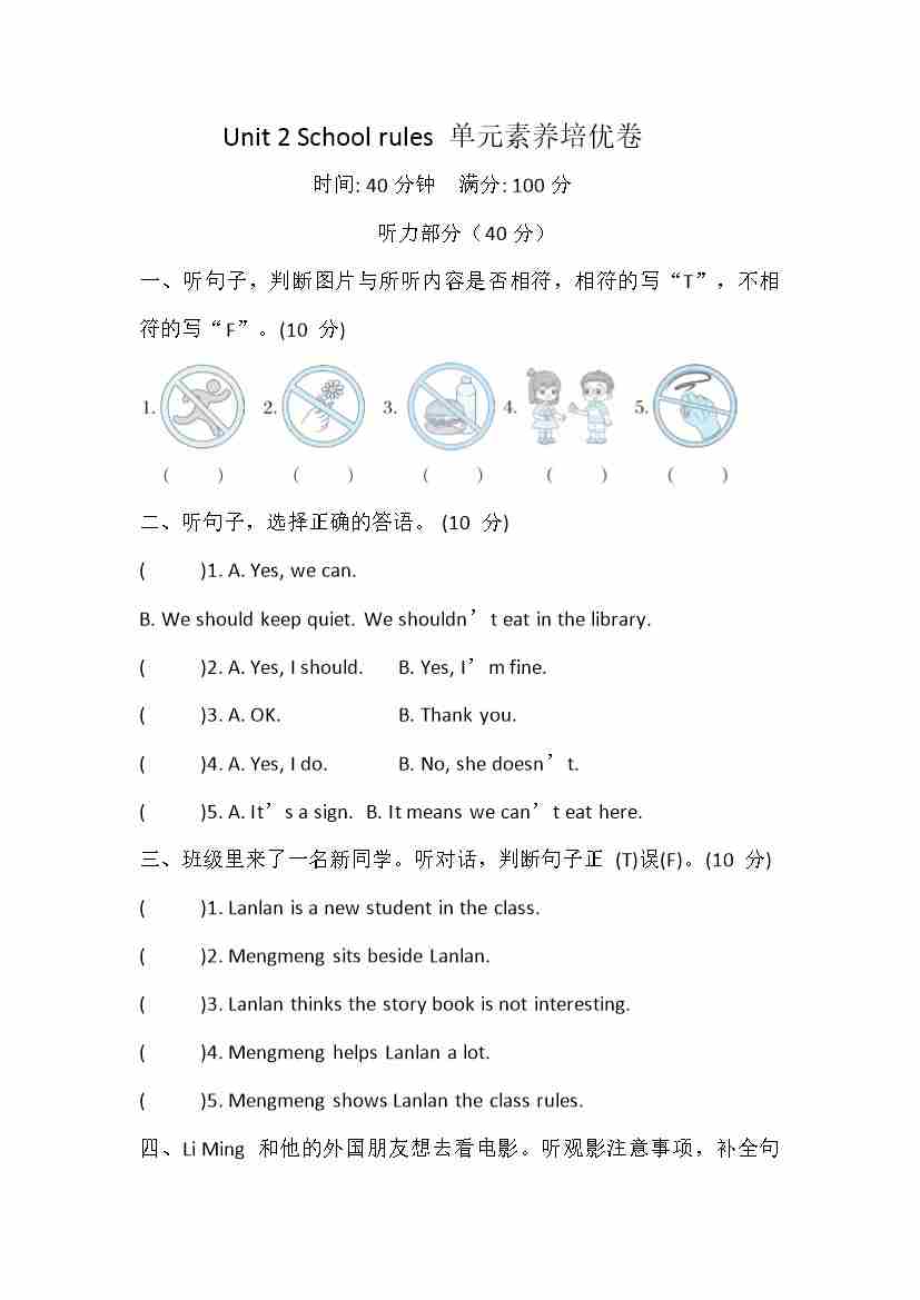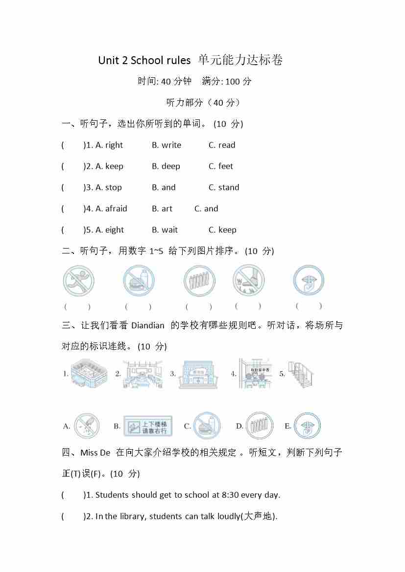 Unit 2 School rules 单元能力达标卷(含答案,含听力原文,无听力音频)