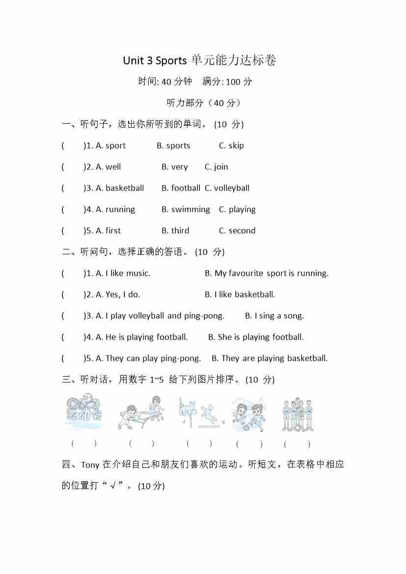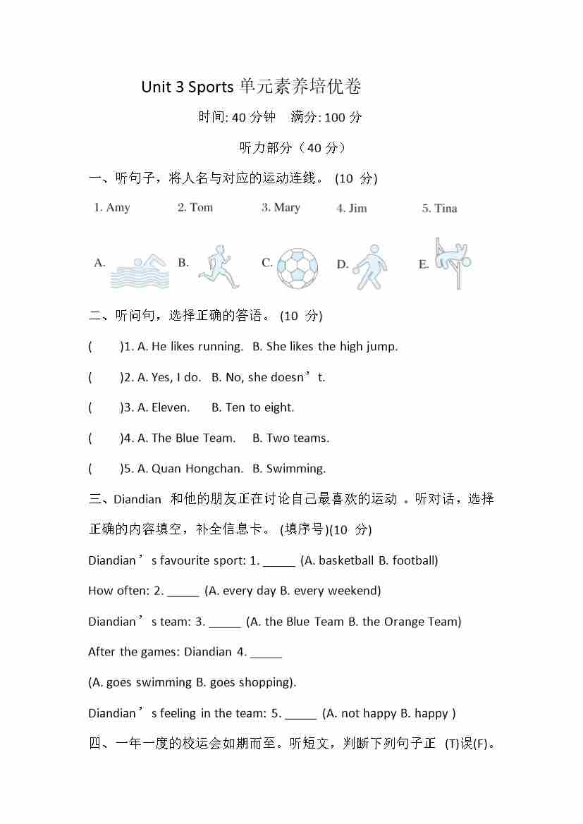 Unit 3 Sports 单元能力达标卷(含答案,含听力原文,无听力音频)