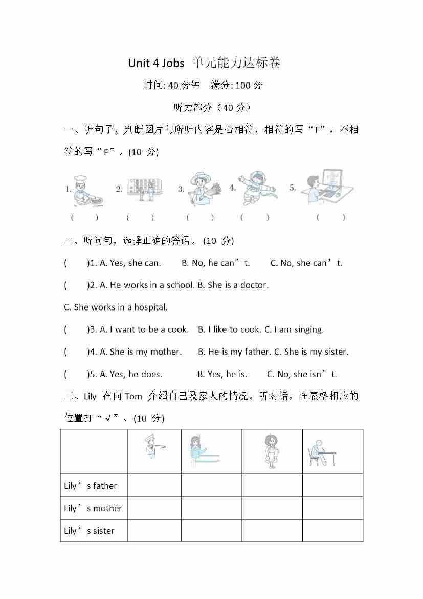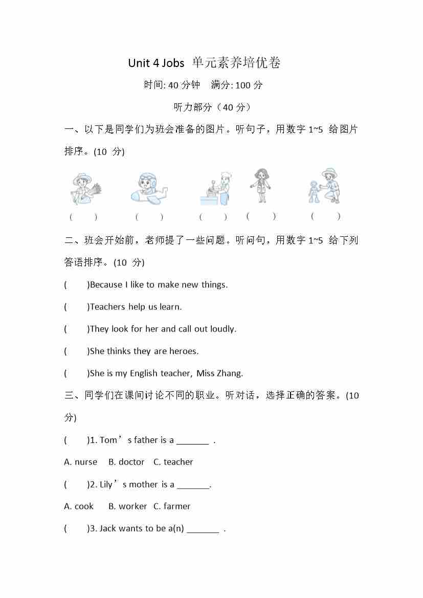 Unit 4 Jobs 单元能力达标卷(含答案,含听力原文,无听力音频)