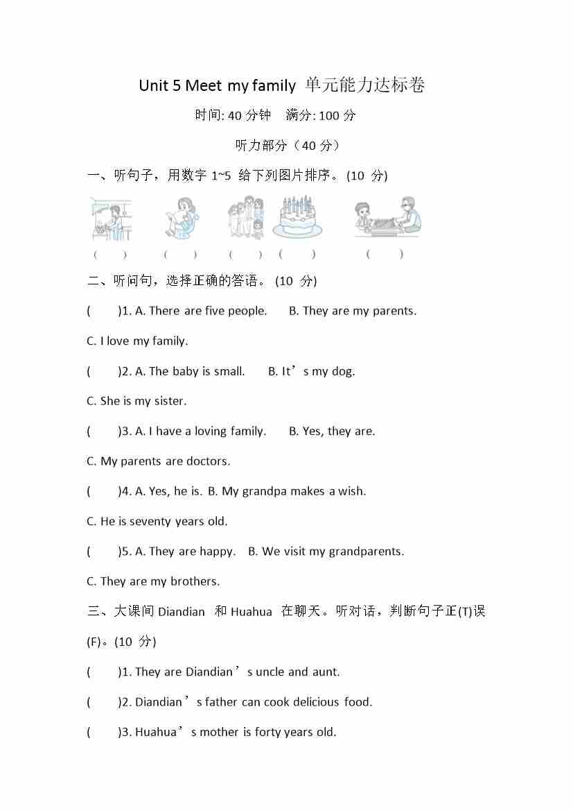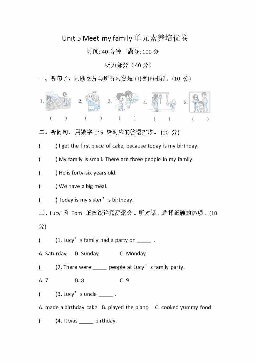 Unit 5 Meet my family 单元能力达标卷(含答案,含听力原文,无听力音频)