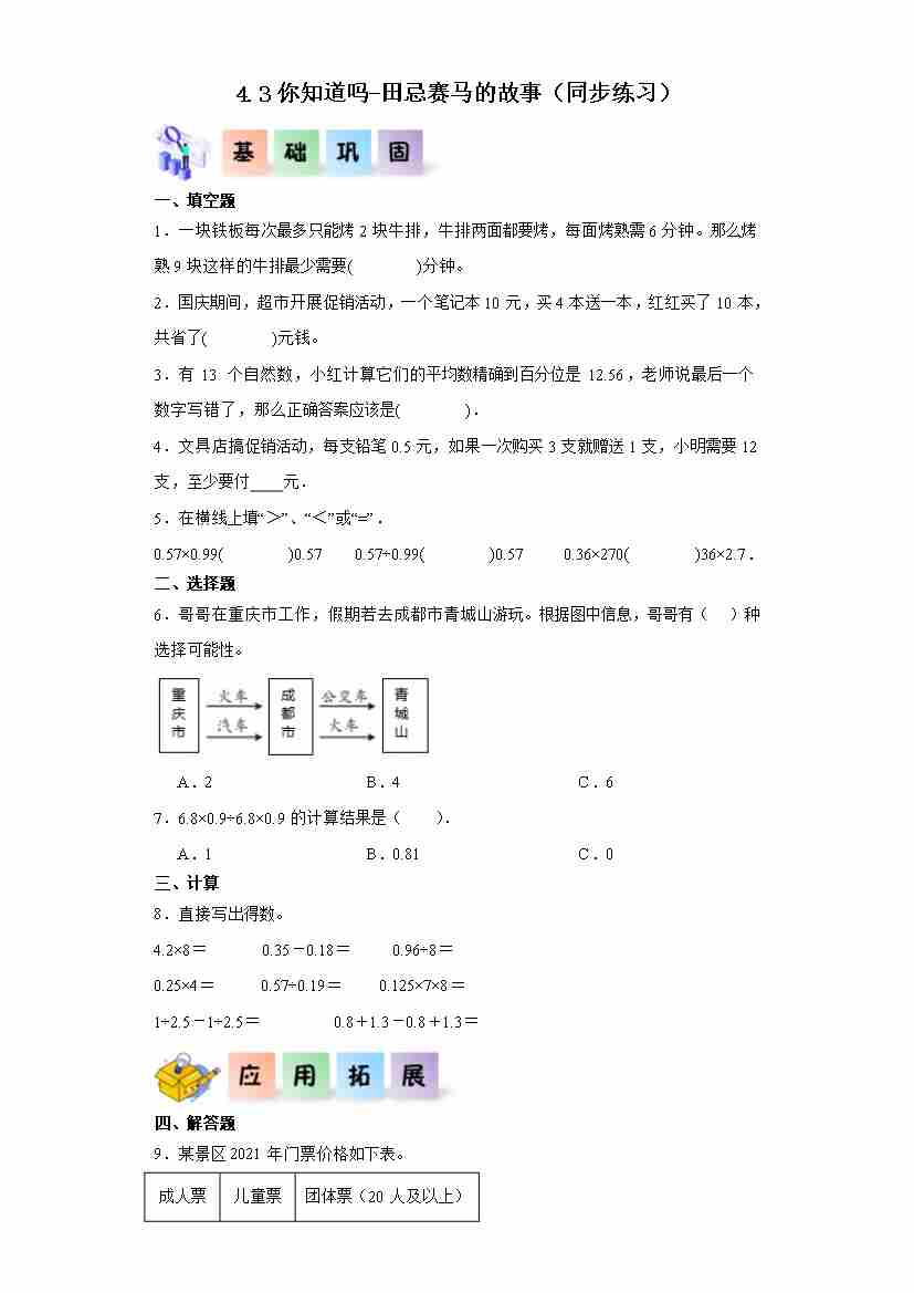 4.3你知道吗-田忌赛马的故事(同步练习)五年级数学上册课后分层作业(西师大版)