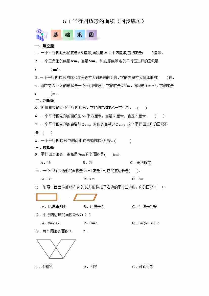 5.1平行四边形的面积(同步练习)五年级数学上册课后分层作业(西师大版)
