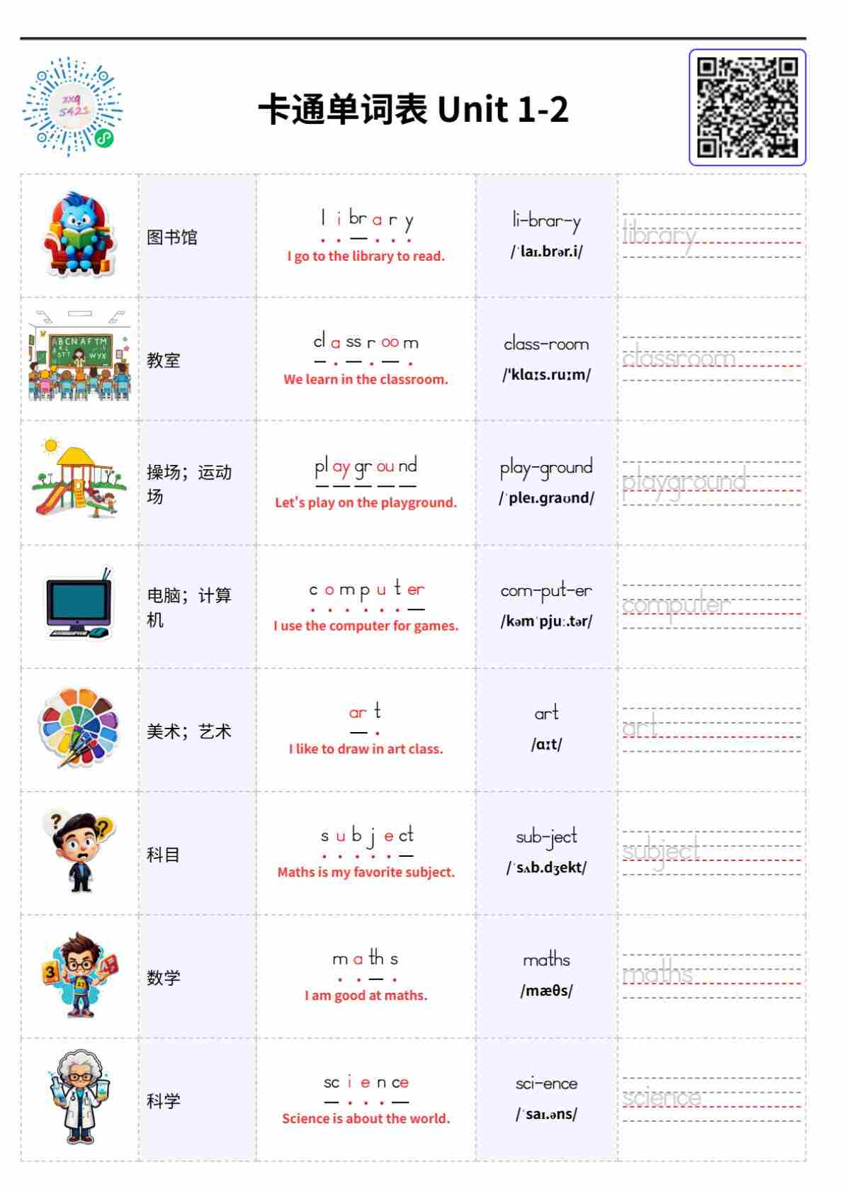 卡通单词表 Unit 1-2