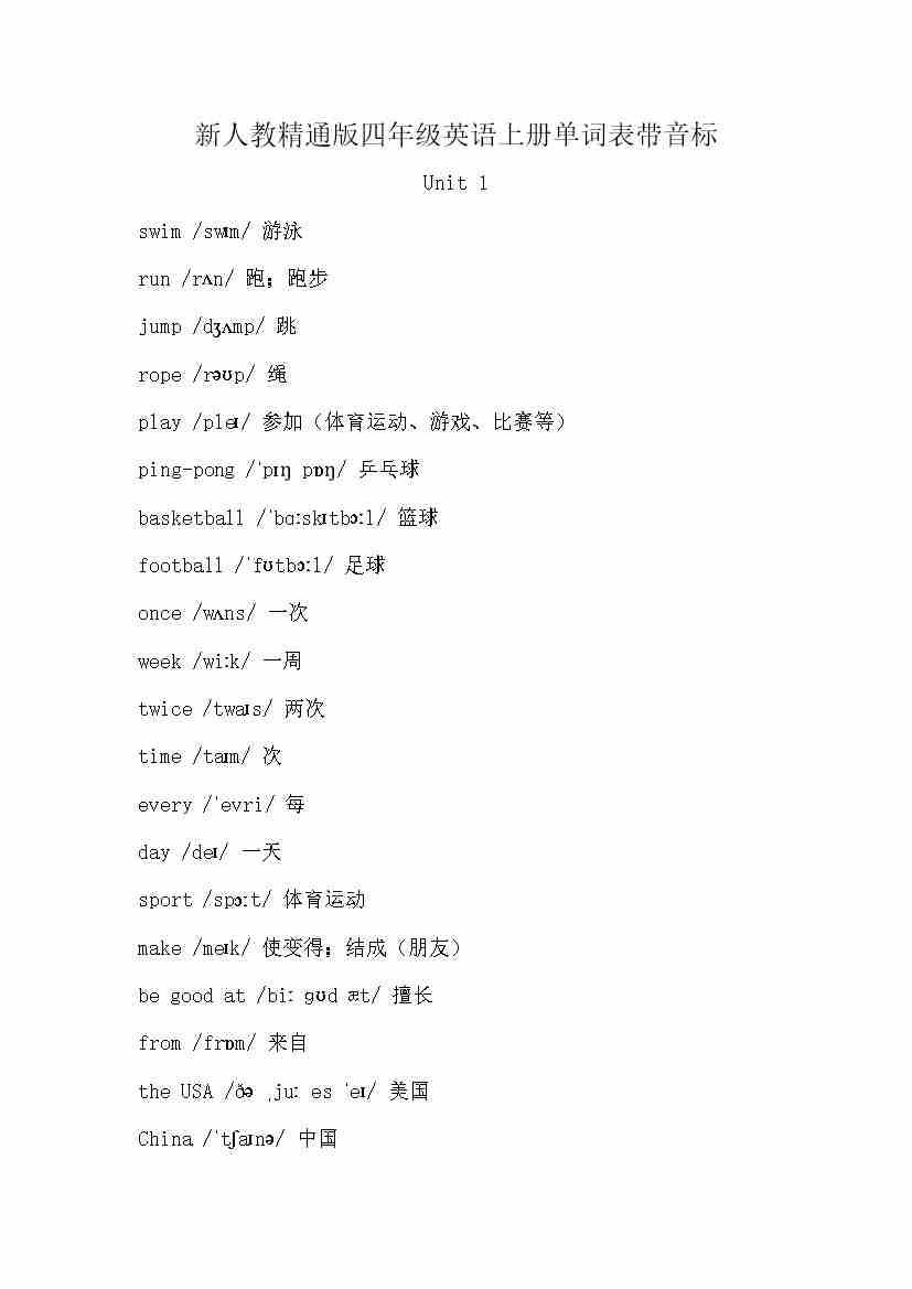 人教精通版(三起)四年级英语上册单词表带音标
