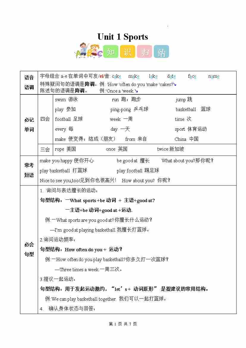 Unit 1 Sports(知识清单)英语人教精通版四年级上册(新教材)