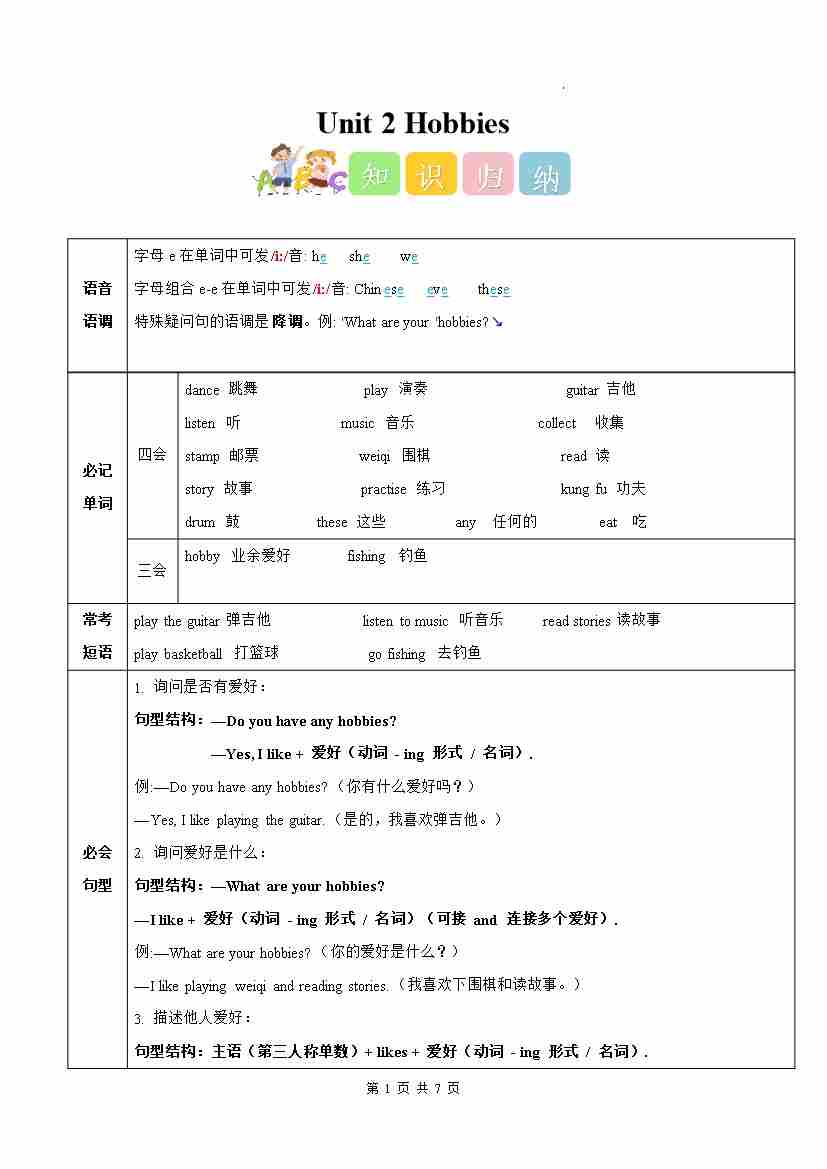 Unit 2 Hobbies(知识清单)人教精通版四年级上册(新教材)
