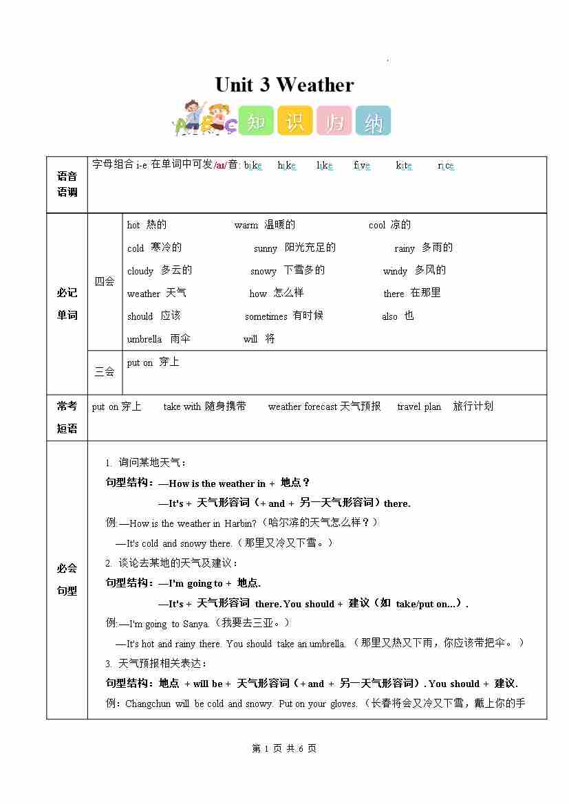 Unit 3 Weather(知识清单)人教精通版四年级上册(新教材)