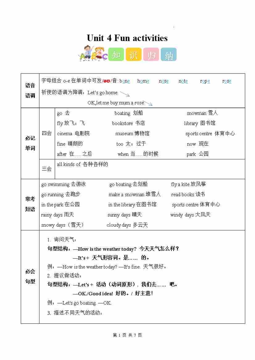 Unit 4 Fun Activities(知识清单)英语人教精通版四年级上册(新教材)