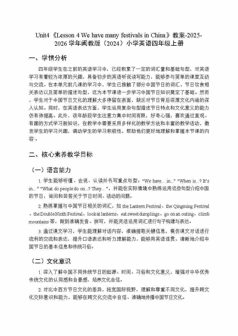 Unit 4 Lesson 4 We have many festivals in China(教案)