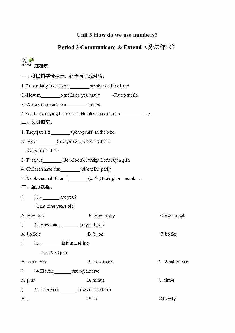 Unit 3 第3课时 Communicate & Extend(分层作业)英语沪教版四年级上册(新教材)