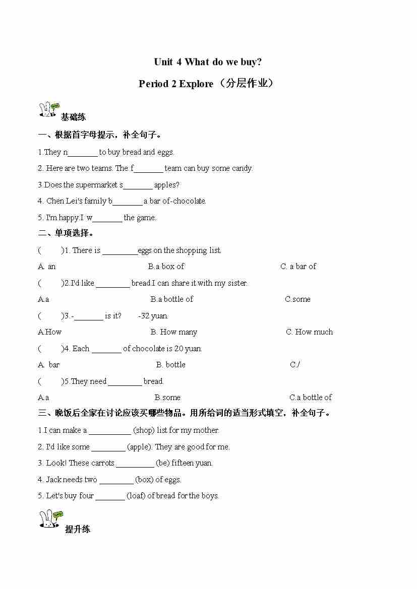 Unit 4 第2课时 Explore(分层作业)英语沪教版四年级上册(新教材)