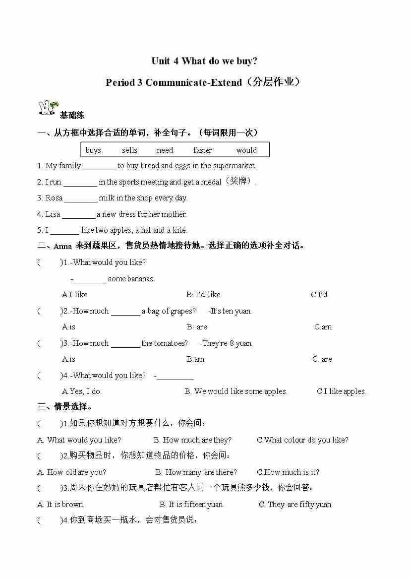 Unit 4 第3课时 Communicate-Extend(分层作业)英语沪教版四年级上册(新教材)