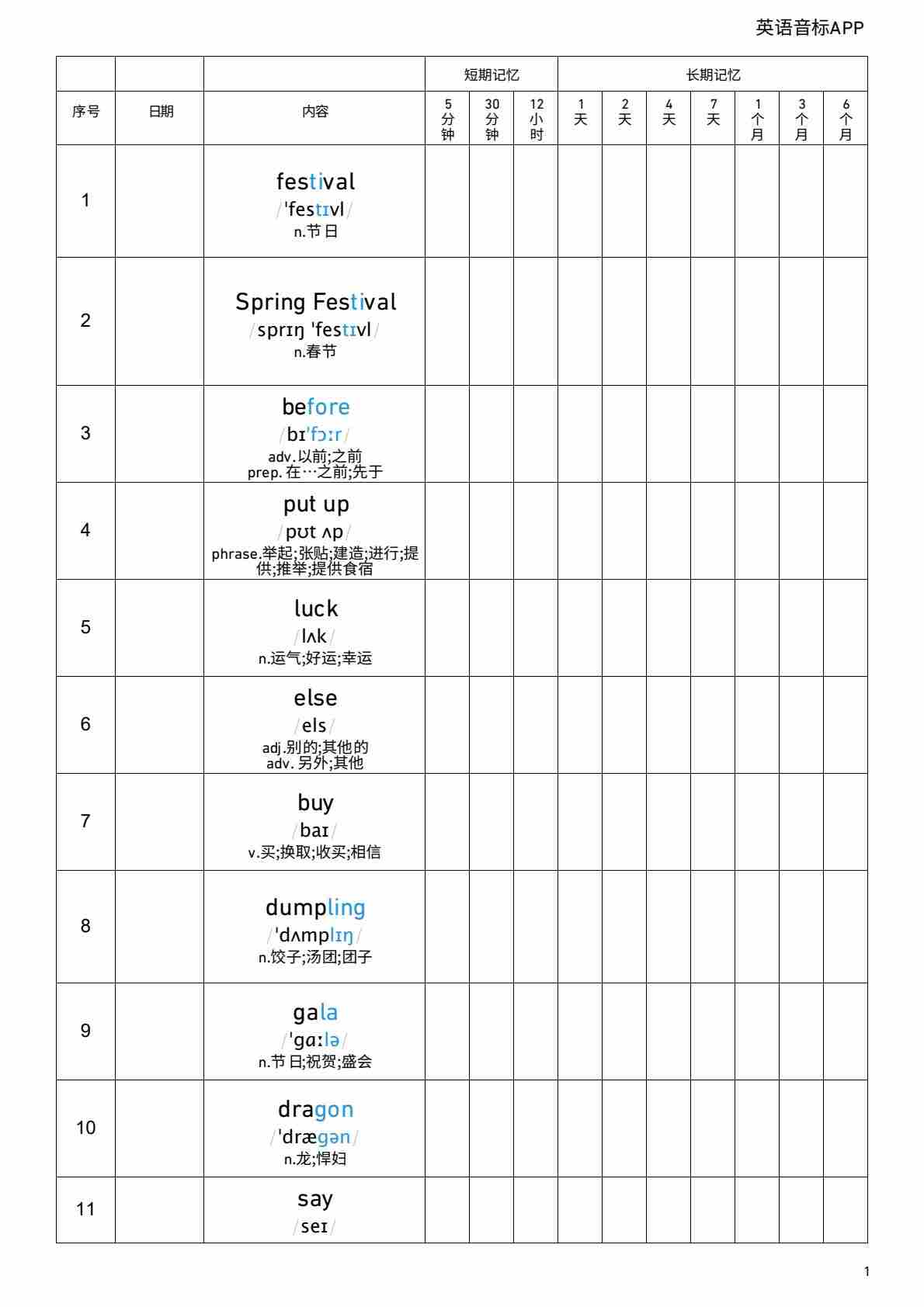 Unit 4 艾宾浩斯记忆表