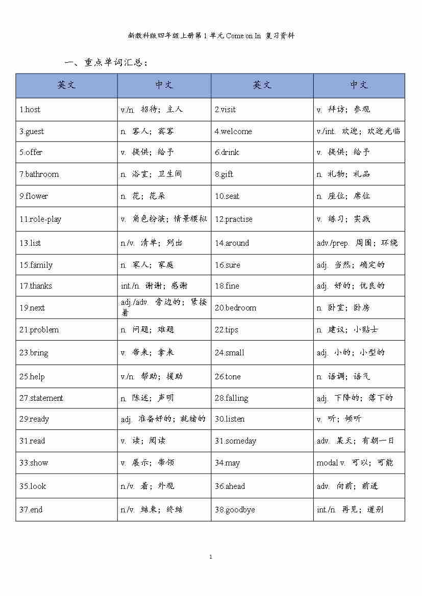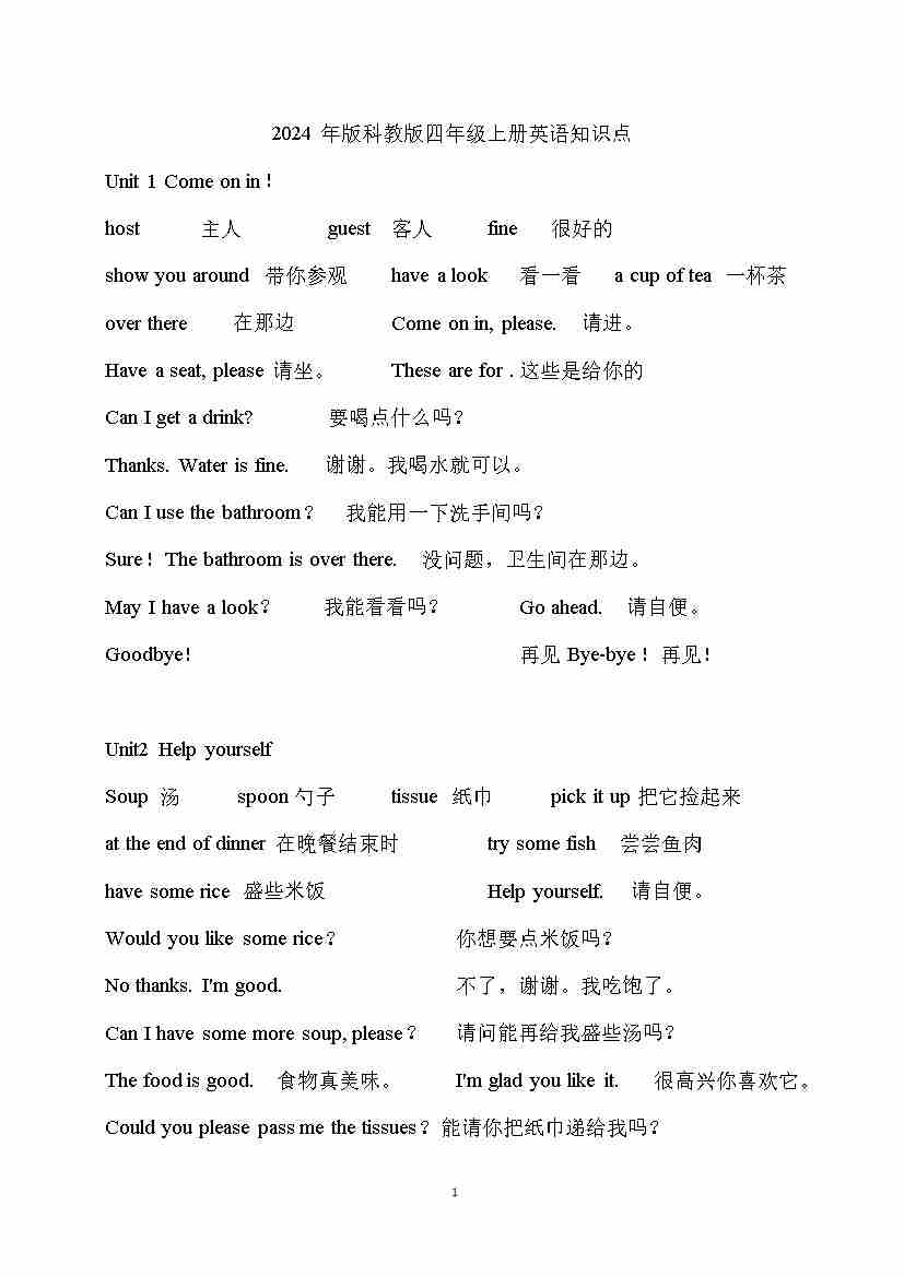 Unit 1 Come on In 复习资料(知识清单)-2025-2026学年教科版(2024)英语四年级上册