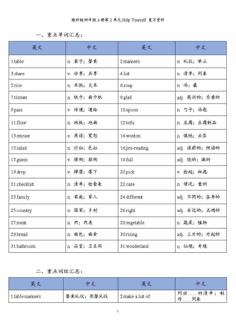 Unit 2 Help Yourself 复习资料(知识清单)-2025-2026学年教科版(2024)英语四年级上册