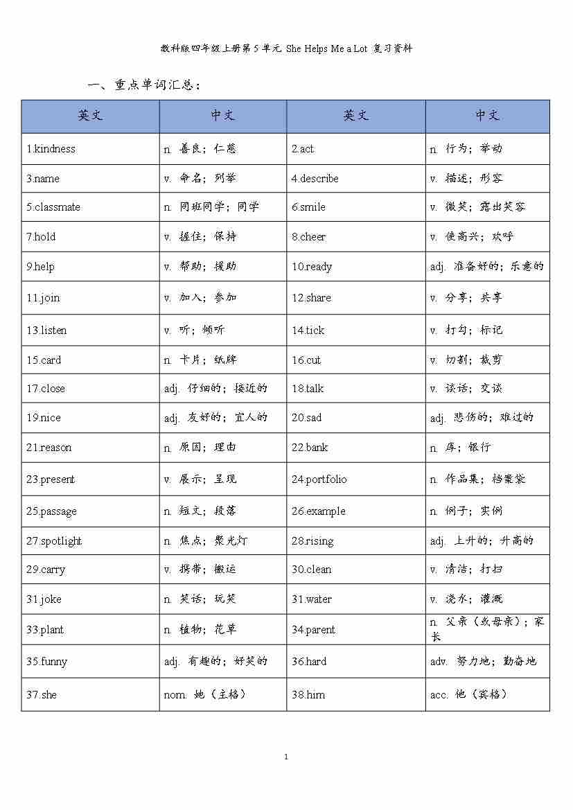 Unit 5 She Helps Me a Lot 复习(知识清单)-2025-2026学年教科版(2024)英语四年级上册