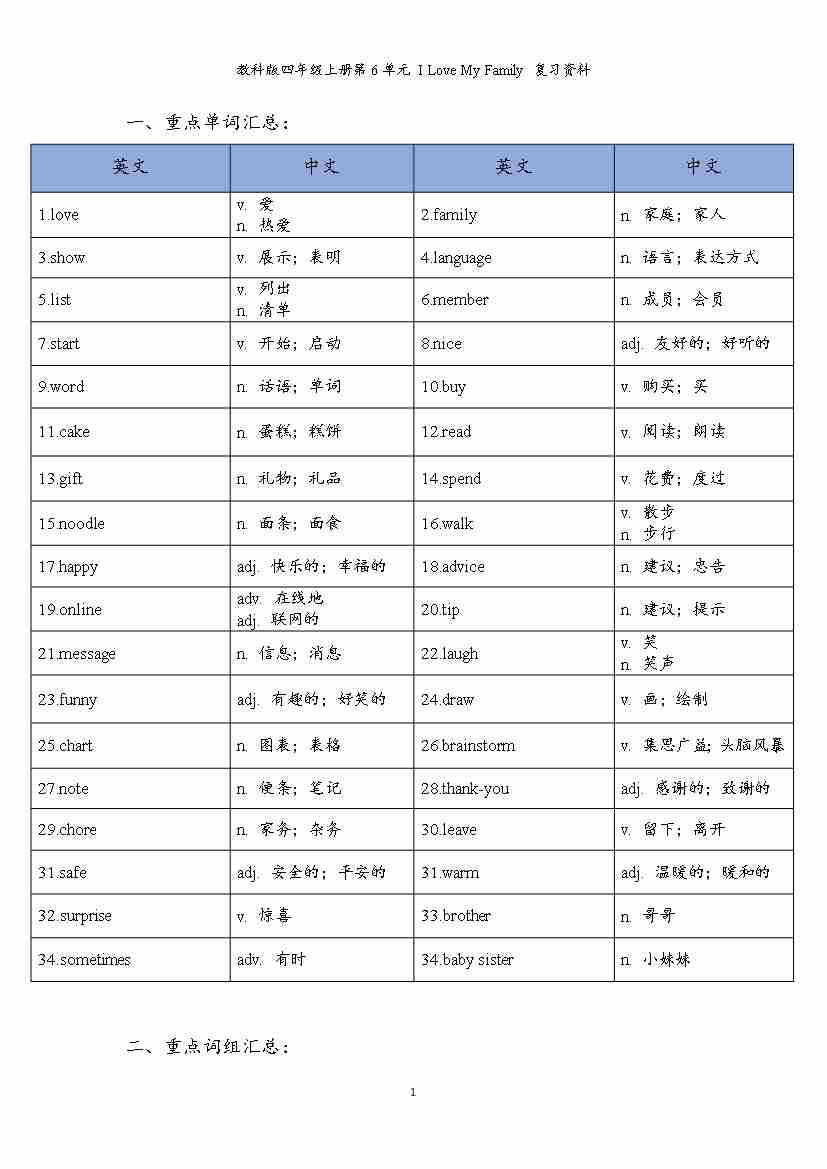 Unit 6 I Love My Family 复习(知识清单)-2025-2026学年教科版(2024)英语四年级上册