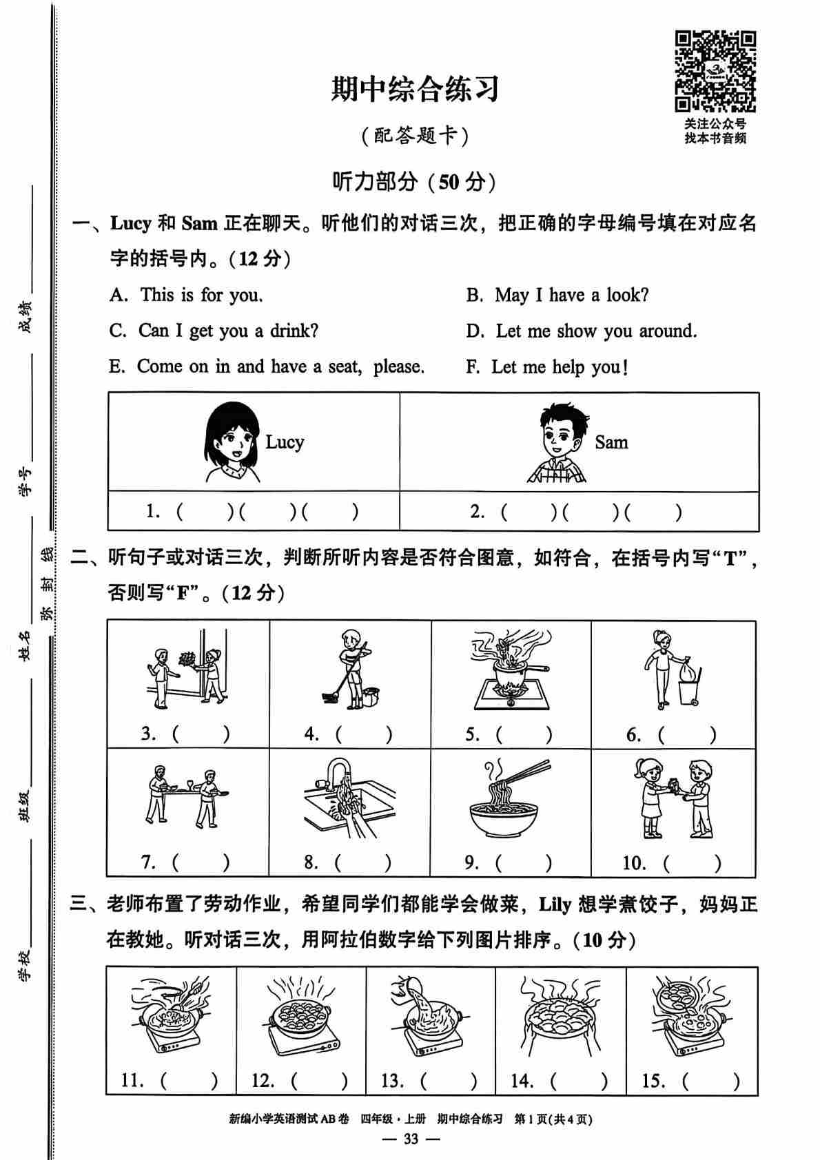 【四上英语】(教科版)《AB卷》英语测试2025 期中综合练习(1)