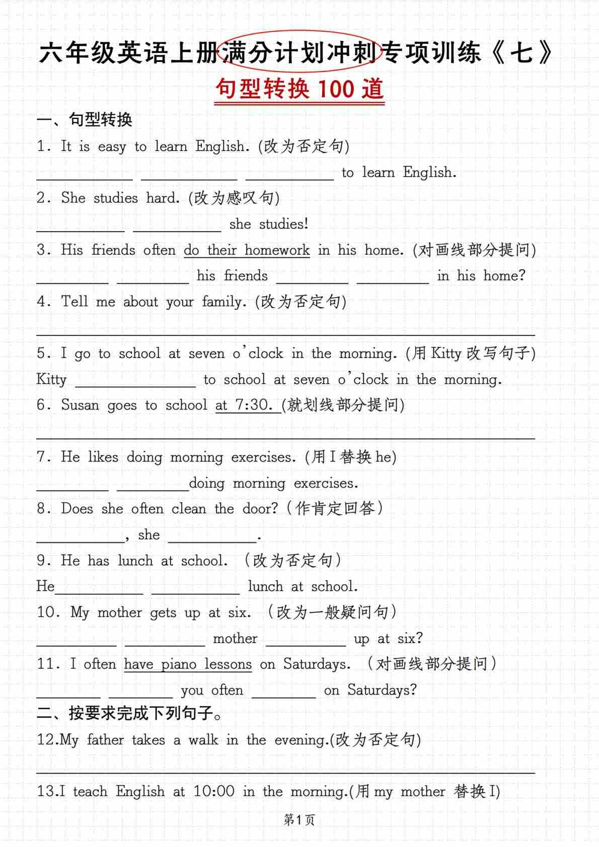 人教精通版《六年级英语上册满分计划冲刺专项训练《七》句型转换100道》_