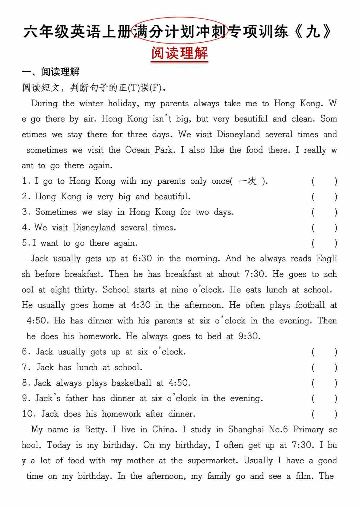 人教精通版《六年级英语上册满分计划冲刺专项训练《九》阅读理解》_