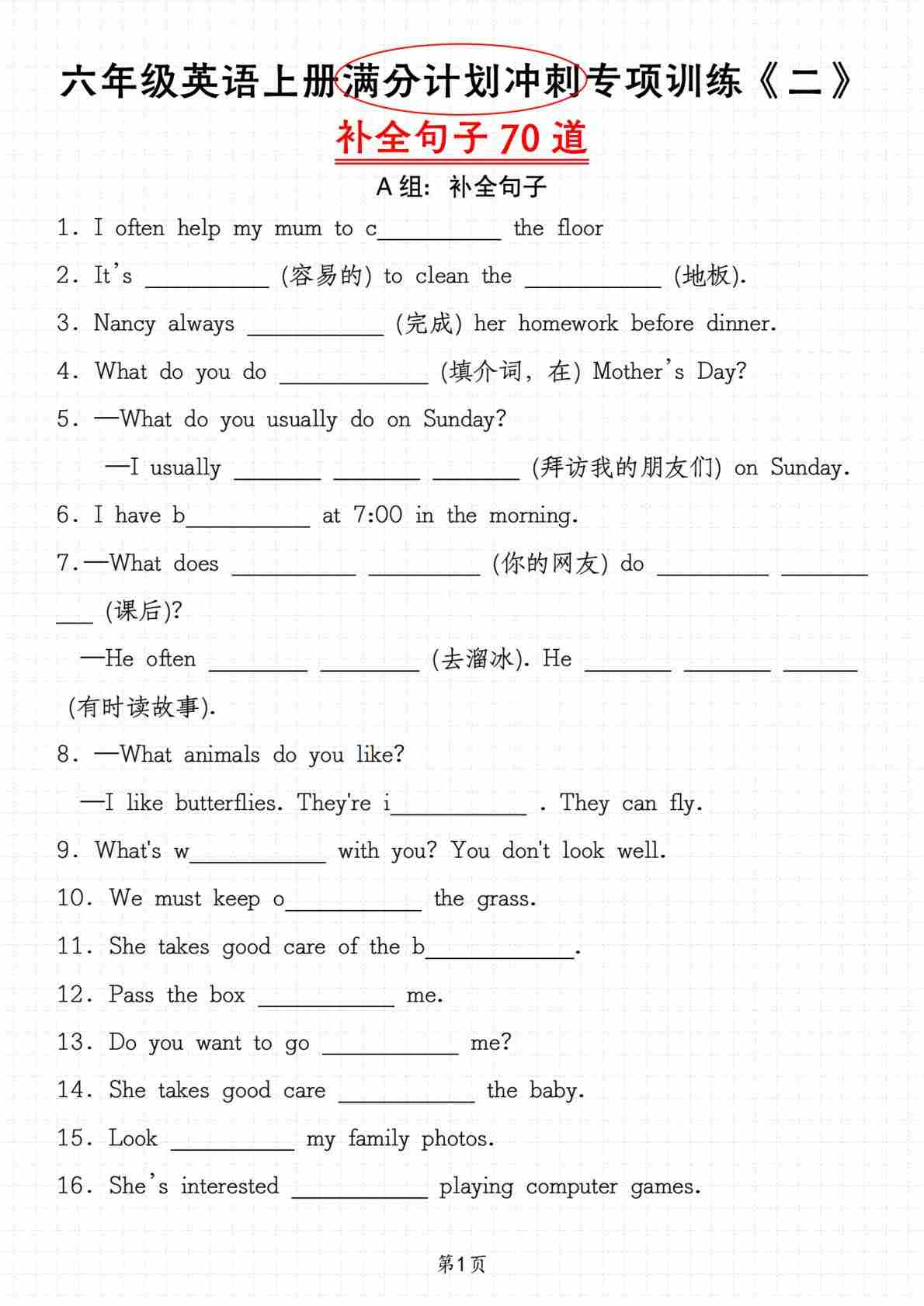 人教精通版《六年级英语上册满分计划冲刺专项训练《二》补全句子70道》_