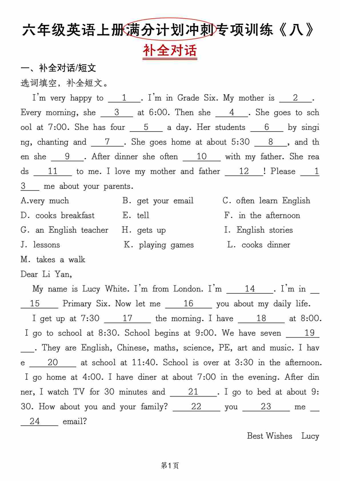 人教精通版《六年级英语上册满分计划冲刺专项训练《八》补全对话》_