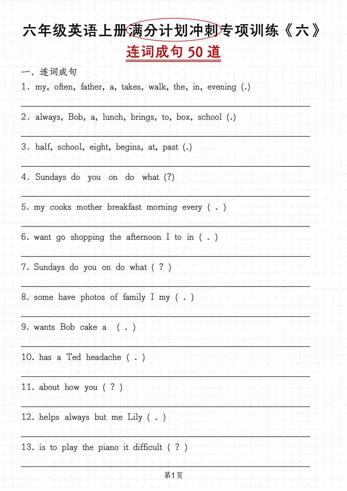 人教精通版《六年级英语上册满分计划冲刺专项训练《六》连词成句50道》_