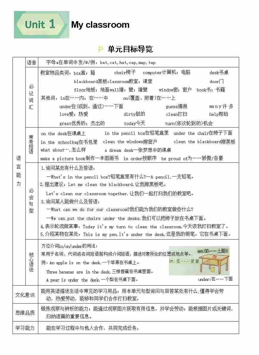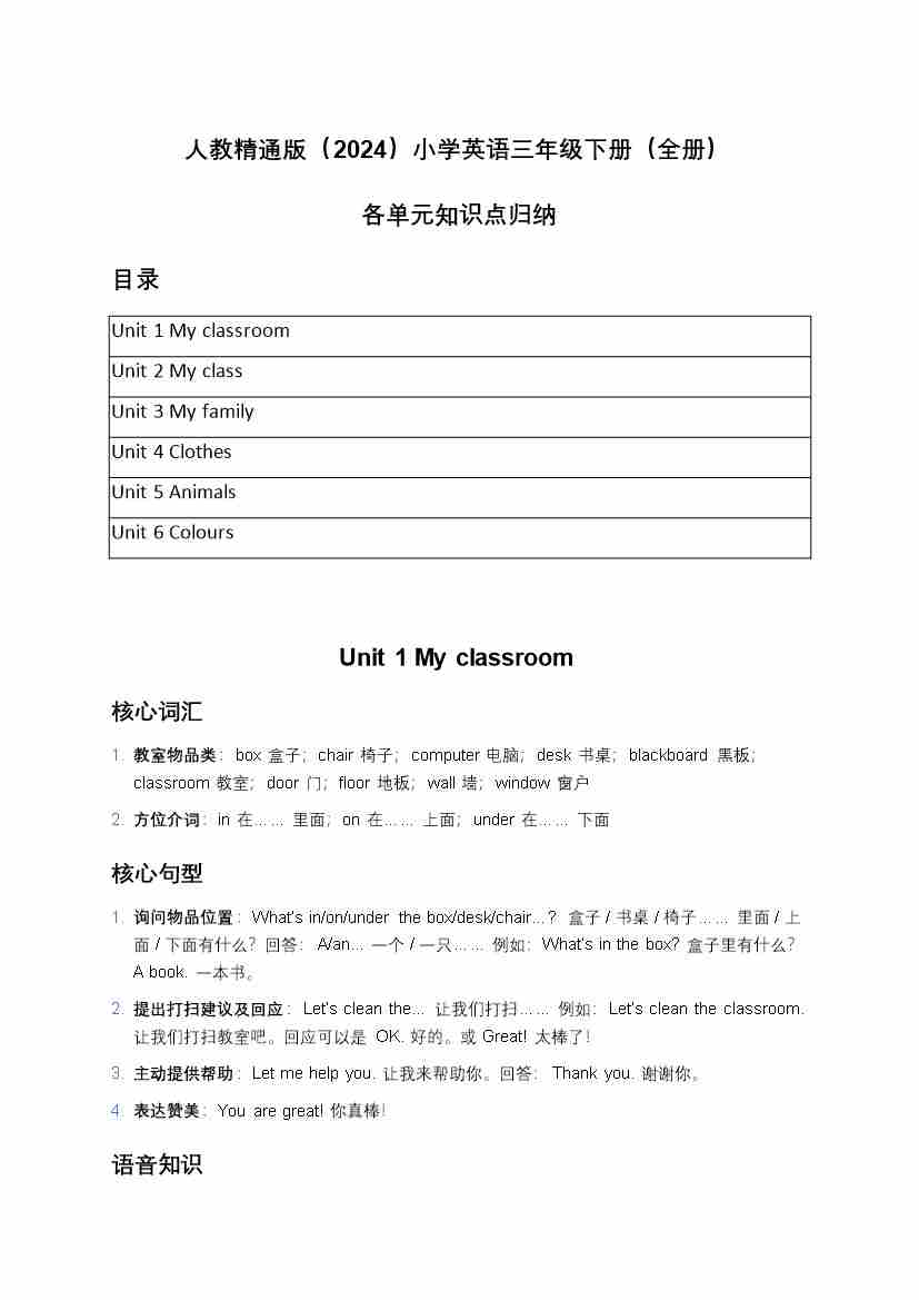 Unit 1 - Unit 6 单元知识点汇总(知识清单)-人教精通版(2024)英语三年级下册