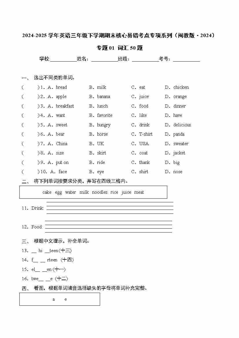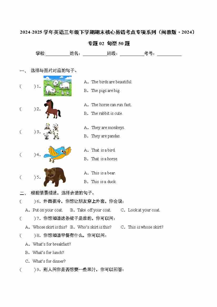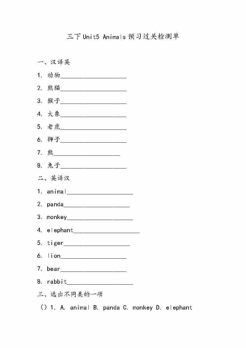 Unit5 Animals(同步练) 人教精通版(2024)英语三年级下册