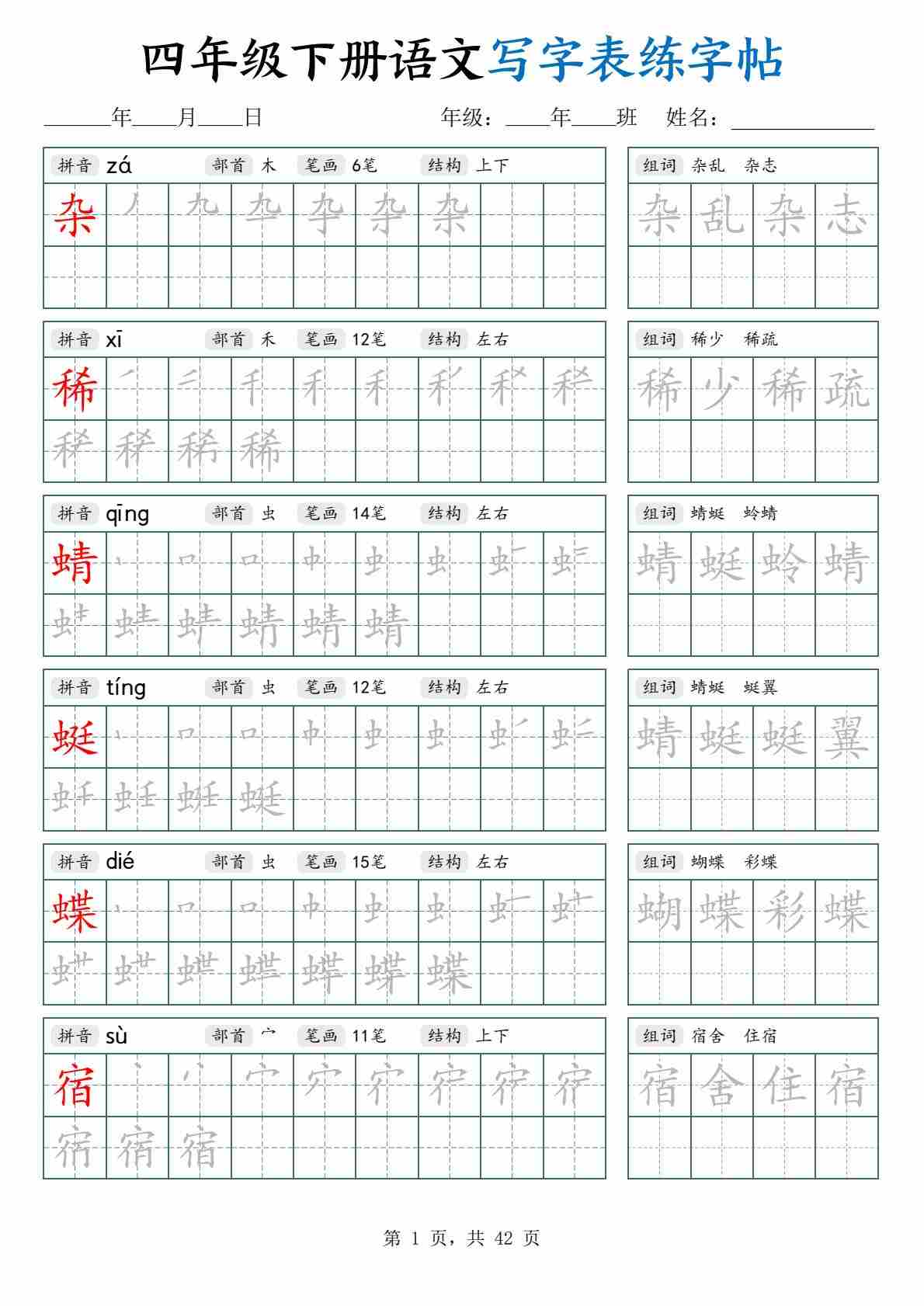 四下语文写字表练字帖(生字拼音笔顺组词)42页