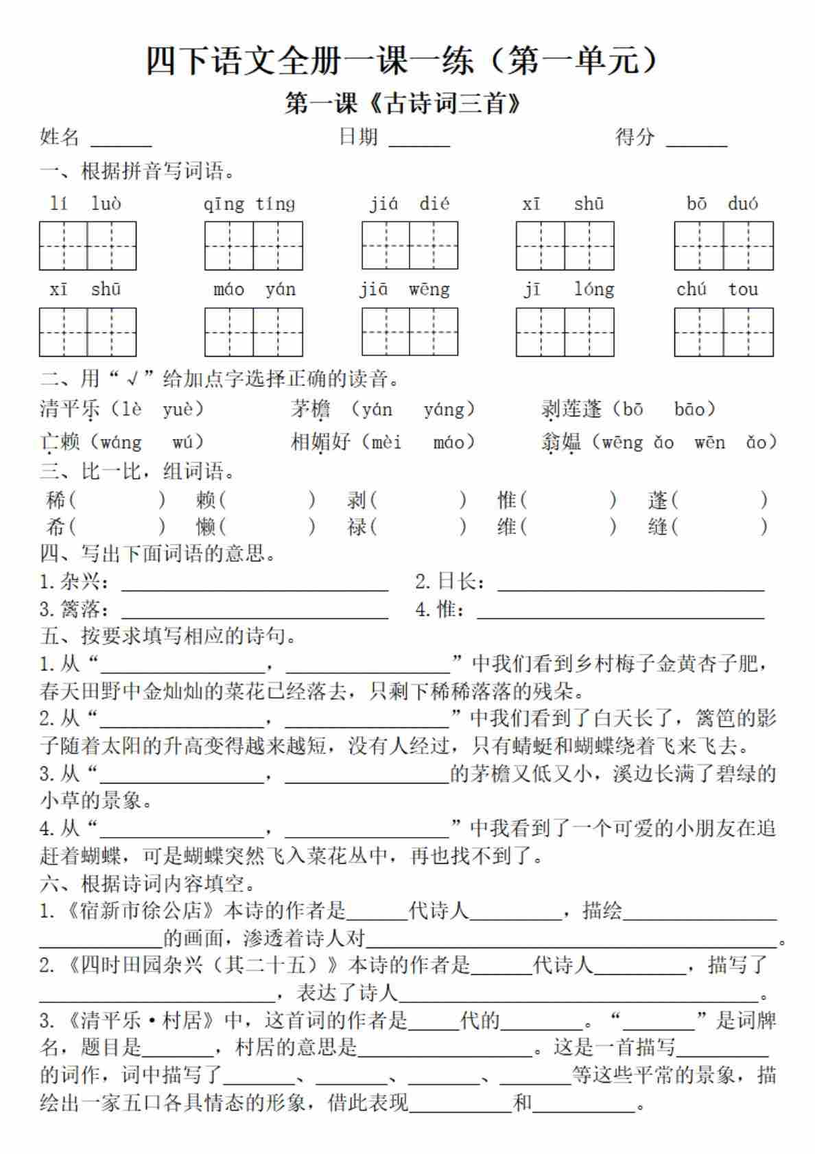 四年级下册语文全册一课一练(附答案62页)