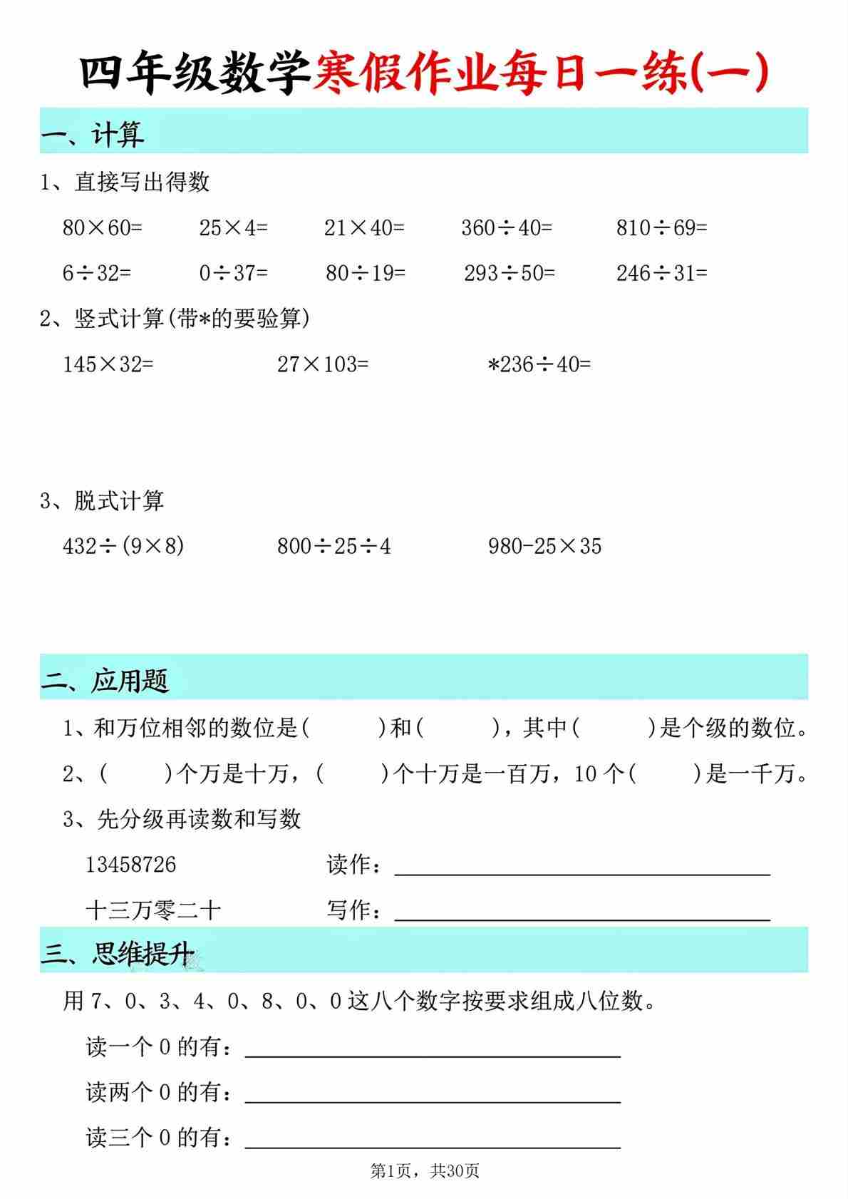 四年级数学寒假作业每日一练30天(30页)