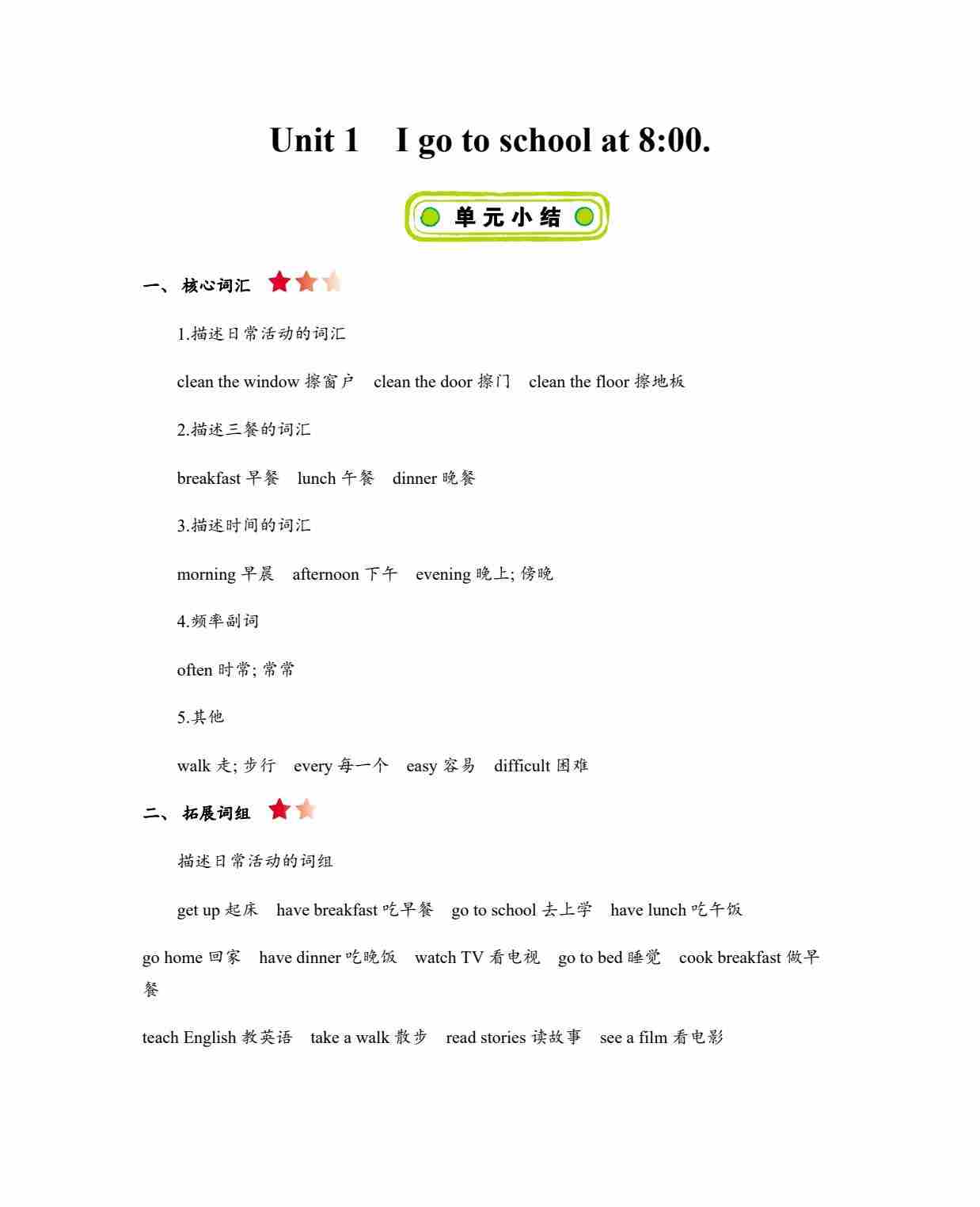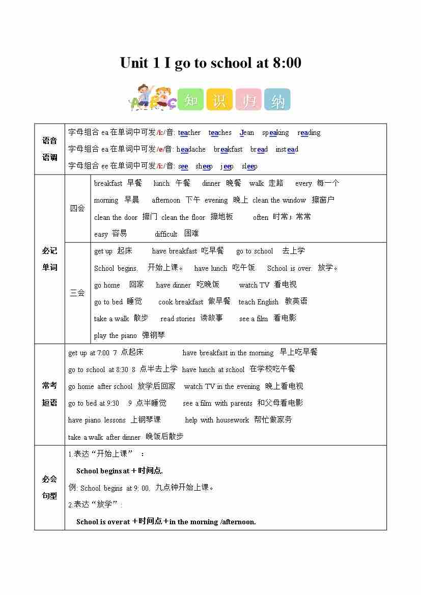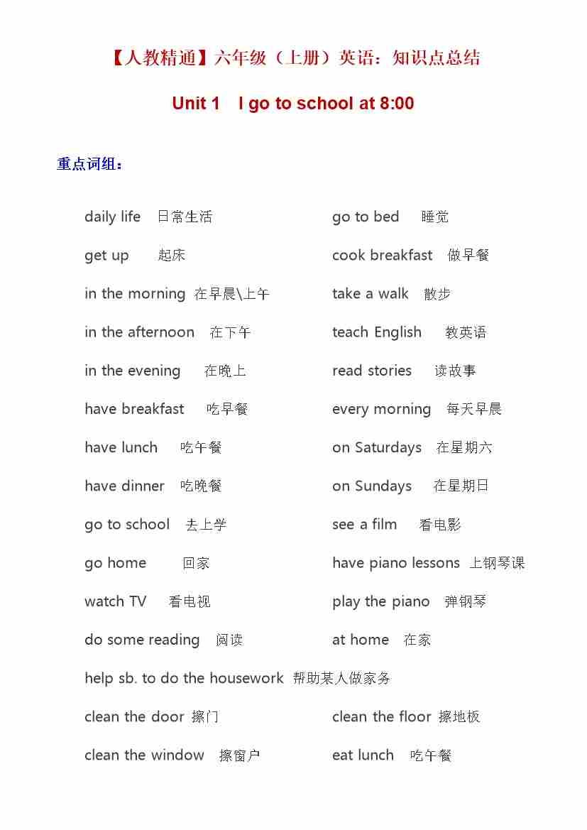 Unit 1 I go to school at 8:00(知识清单)英语人教精通版六年级上册