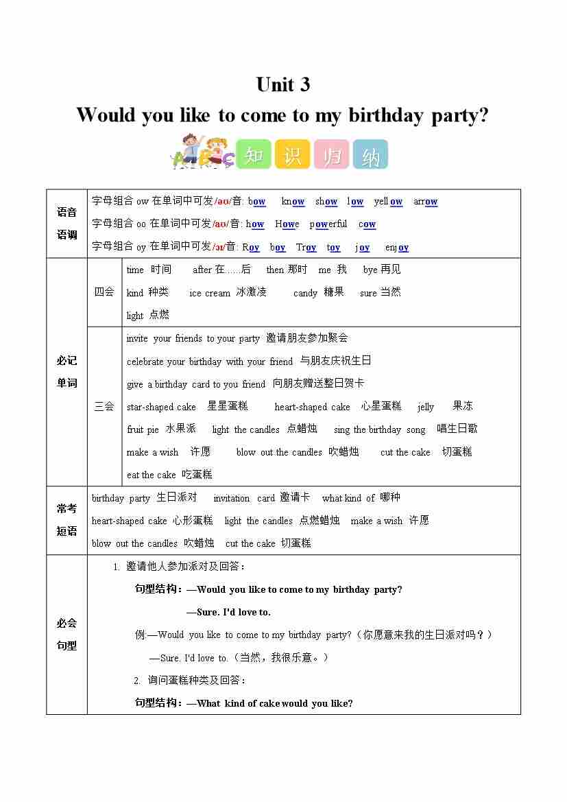 Unit 3 Would you like to come to my birthday party(知识清单)英语人教精通版六年级上册