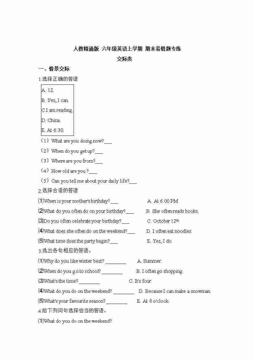 【交际类】人教精通版 六年级英语上学期 期末易错题专练(含答案)