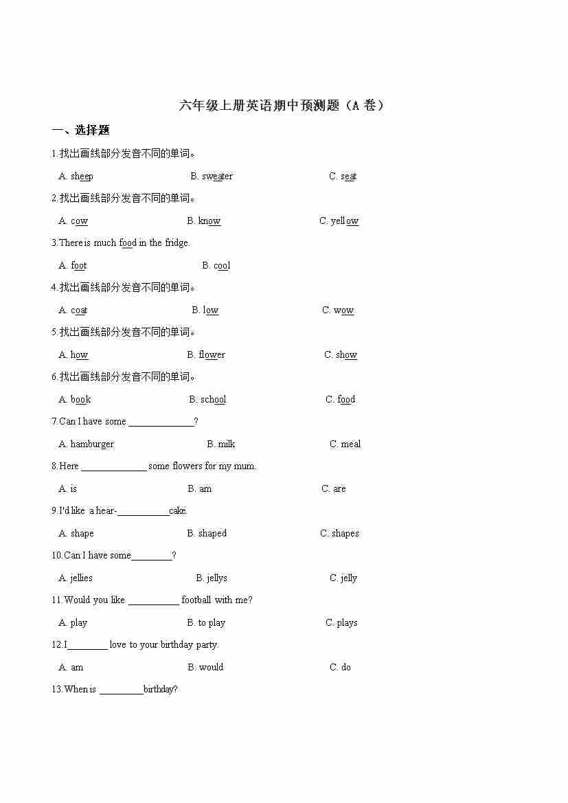 【精品】六年级上册英语期中试卷(A卷)人教精通版(word版,含答案解析)