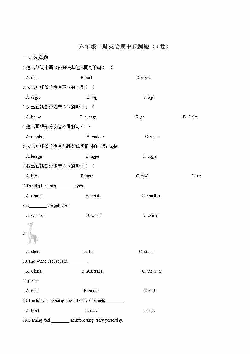 【精品】六年级上册英语期中试卷(B卷)人教精通版(word版,含答案解析)