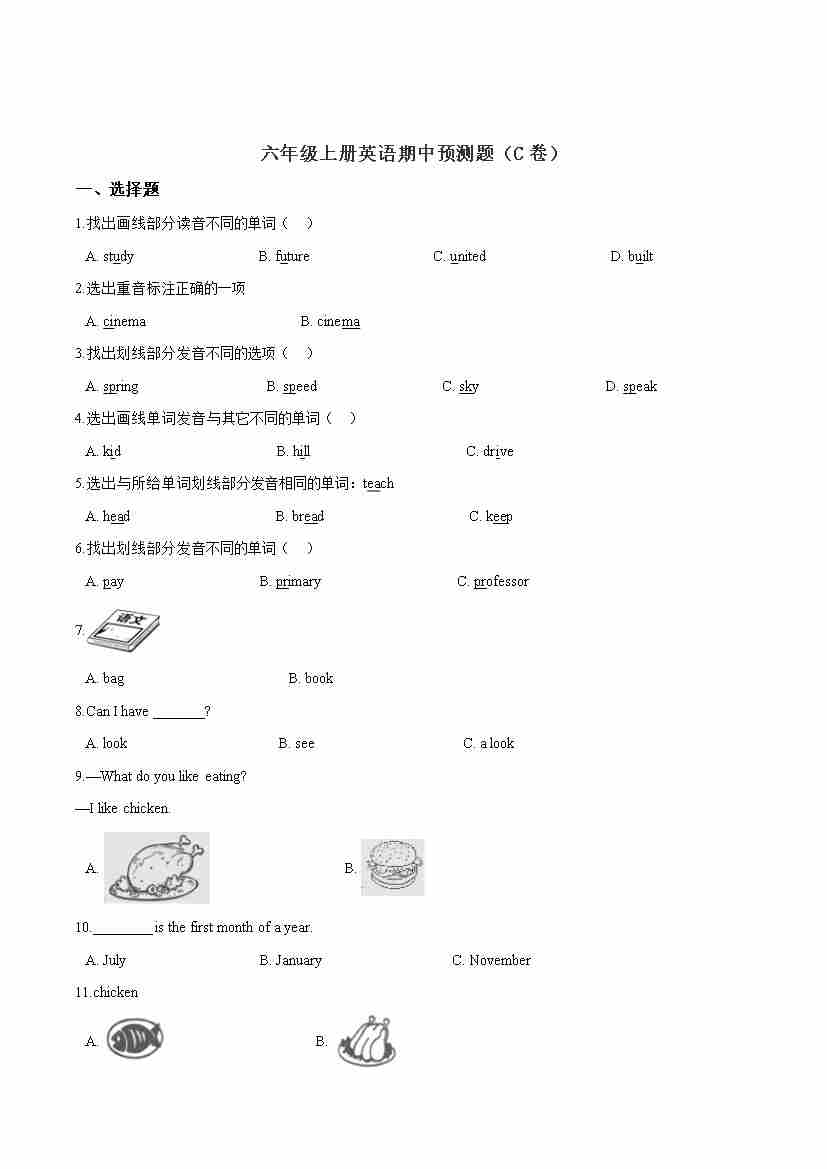 【精品】六年级上册英语期中试卷(C卷)人教精通版(word版,含答案解析)