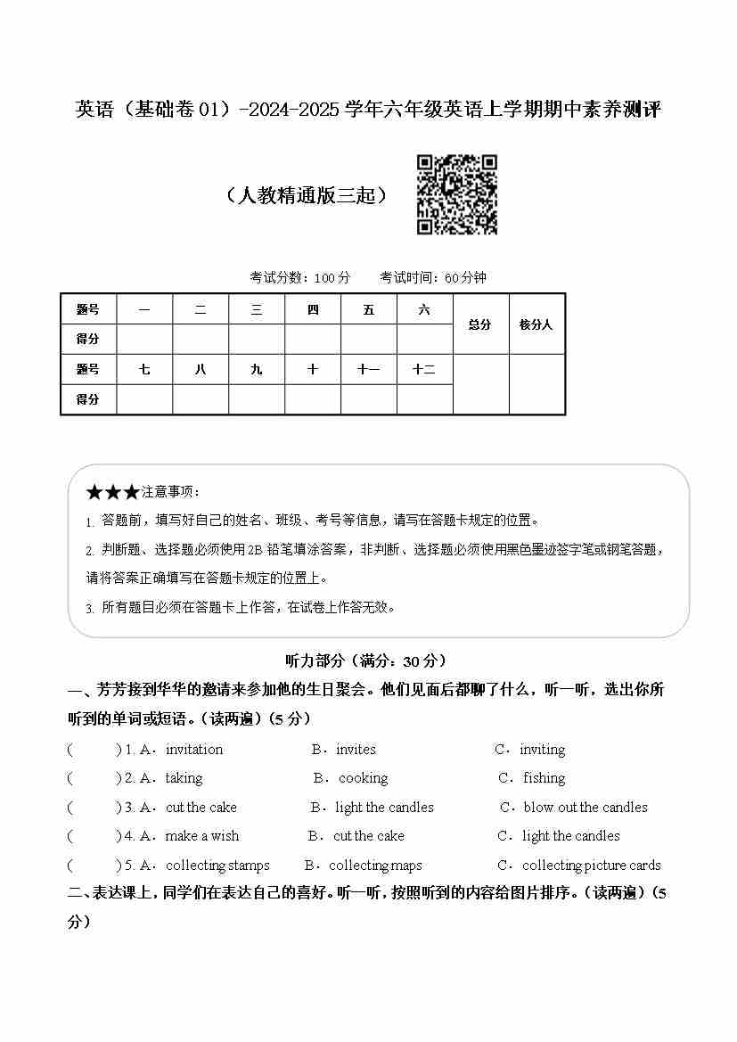 人教精通版英语(基础卷01)(考试版A4)