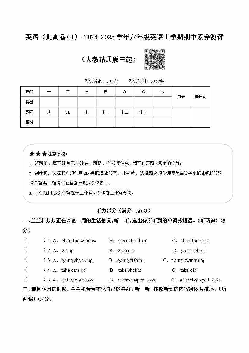 人教精通版英语(提高卷01)(考试版 A4)