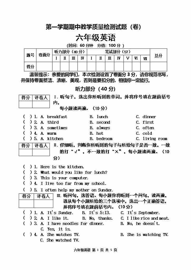 冀教版六年级英语上册 期中检测卷(名校卷)(含听力音频及素材+详细解答)