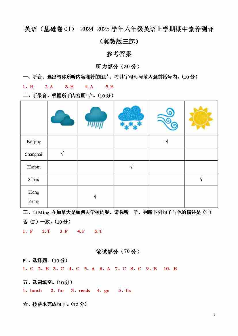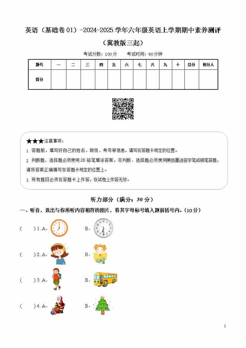 闽教版英语2024-2025学年六年级上册期末模拟测试卷(附参考答案+听力音频)