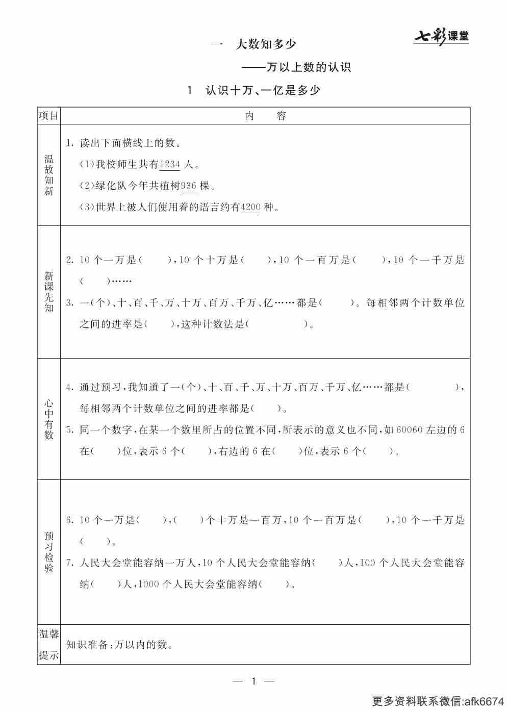 四(上)青岛版数学六三制七彩课堂预习卡课课练