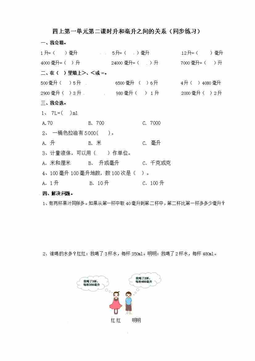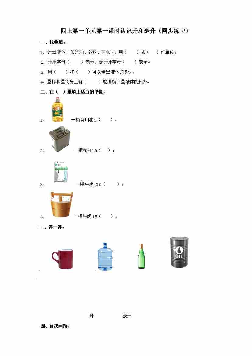 四年级上册数学练习-第一单元第一课时 认识升和毫升 冀教版
