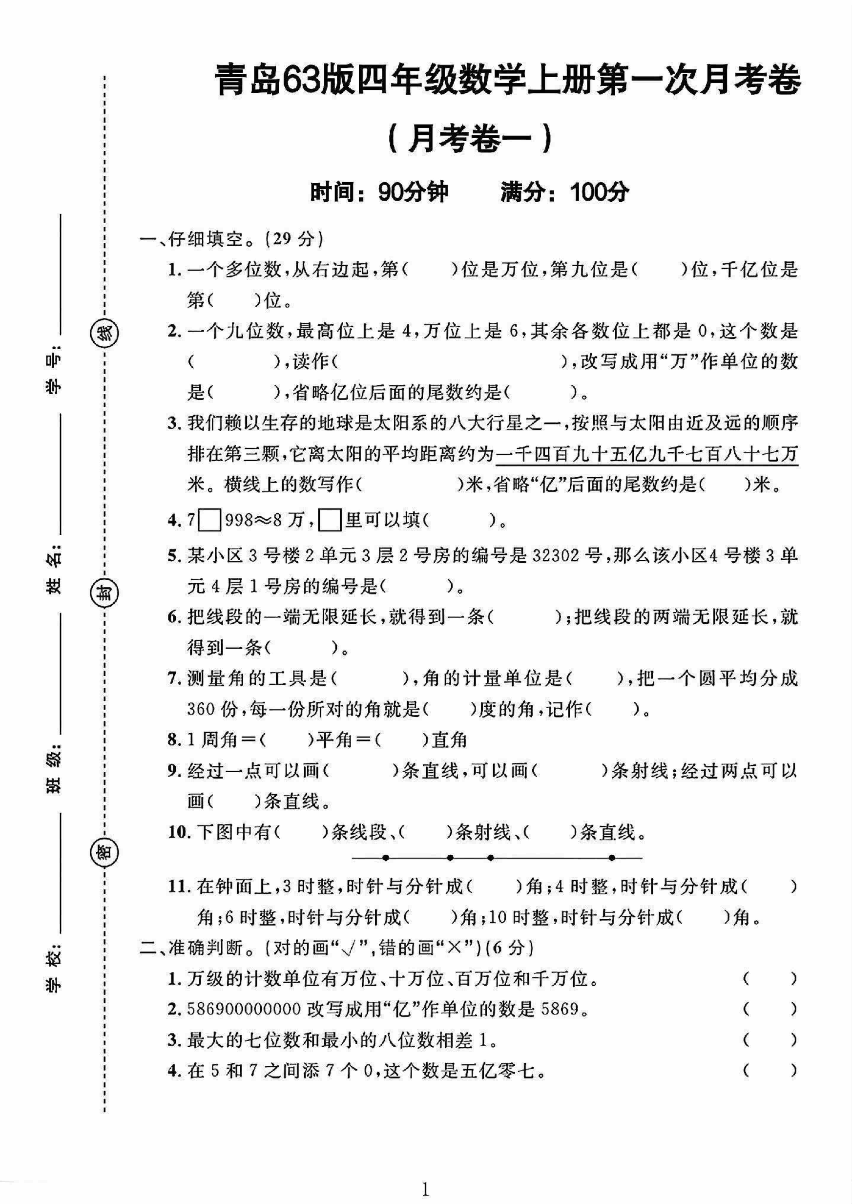 四上青岛五四制数学【期中测试卷】