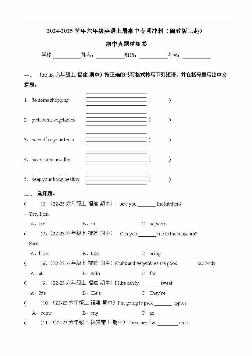 期中真题重组卷-2024-2025学年六年级英语上册期中专项冲刺(闽教版三起)